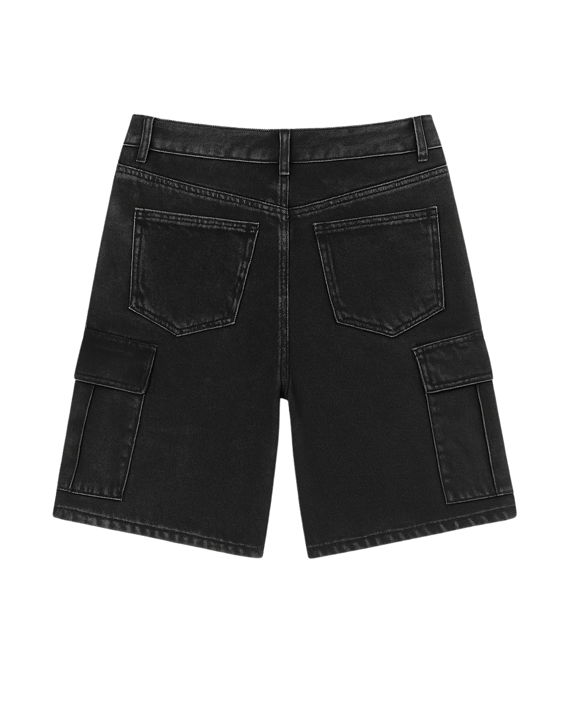 Bermuda cargo de jean color negra con terminado washed, cálidad premium y caída hasta la rodilla. Contiene logo de WaisClub bordado en color negro en el bolsillo derecho.