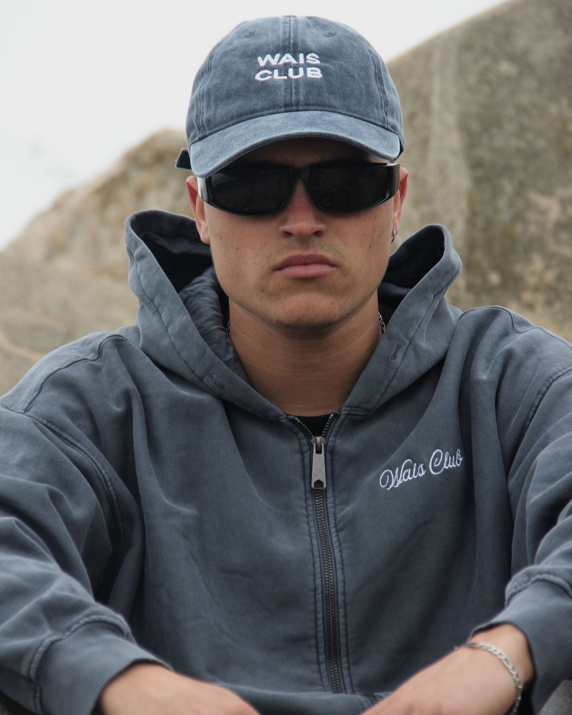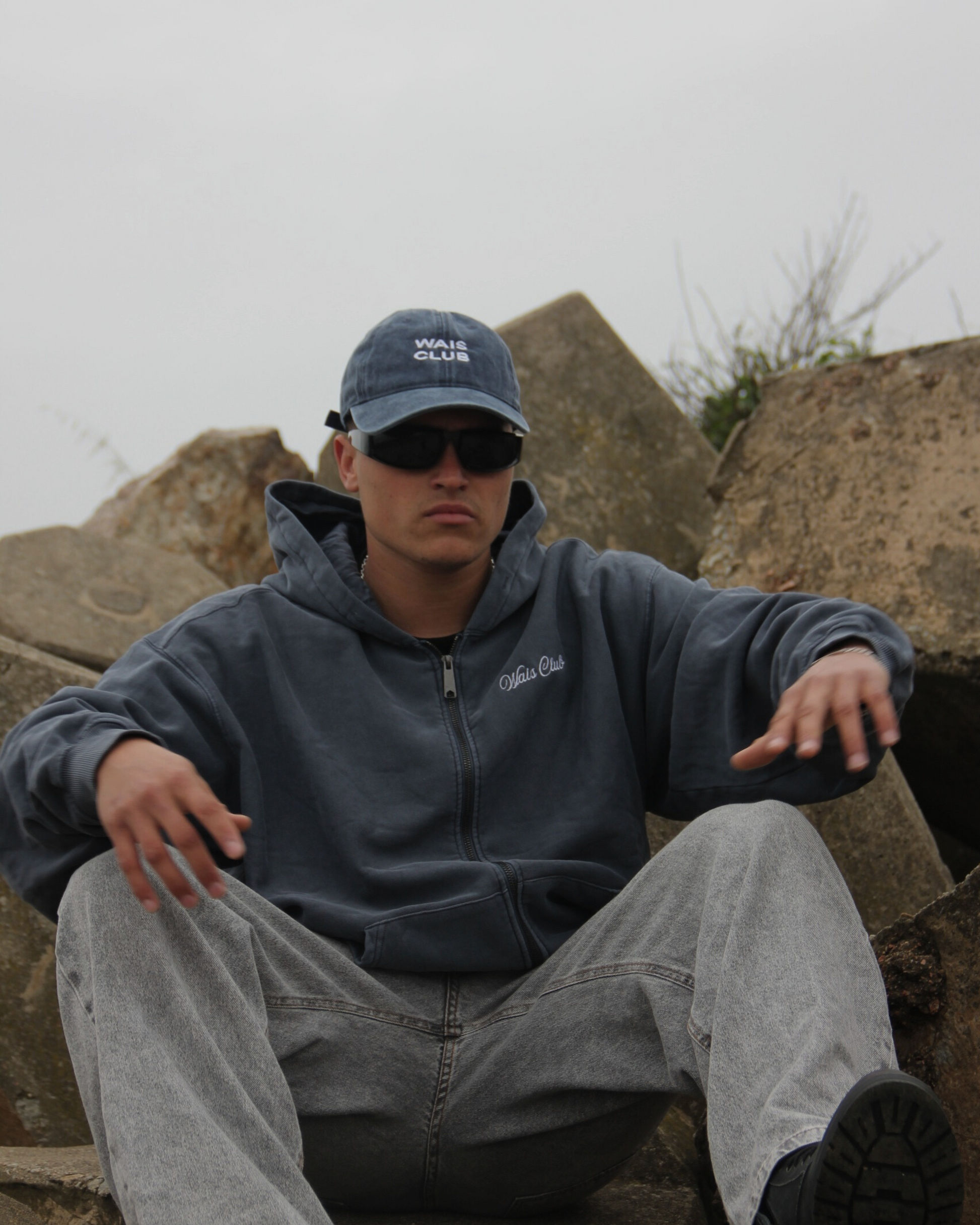 Campera color azul lavado corte oversize, mangas holgadas, 100% de algodón pesado con diseño bordado en cursiva moderna asegurando un estilo tremendo y una durabilidad prolongada.