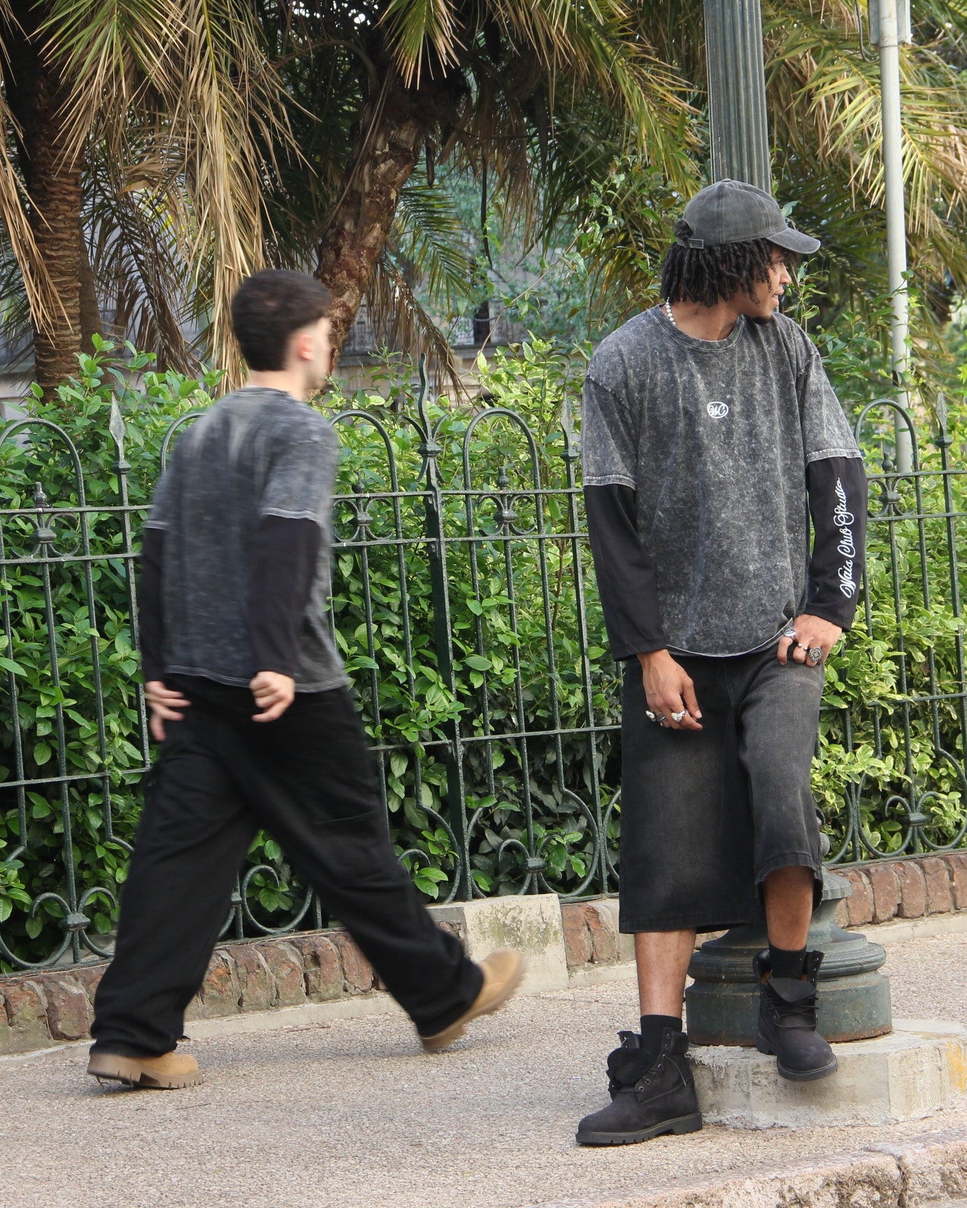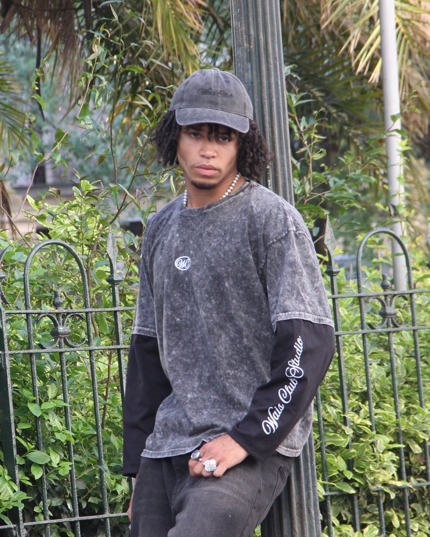 Remera gris lavada de mangas largas negras, confeccionada de algodón con un ajuste relajado y cuello redondo acanalado. El frente presenta el logotipo estampado de Wais Club en el centro del pecho, mientras que la parte posterior se mantiene lisa. En la manga izquierda contiene un estampado color blanco (WaisClubStudios) en letra cursiva.