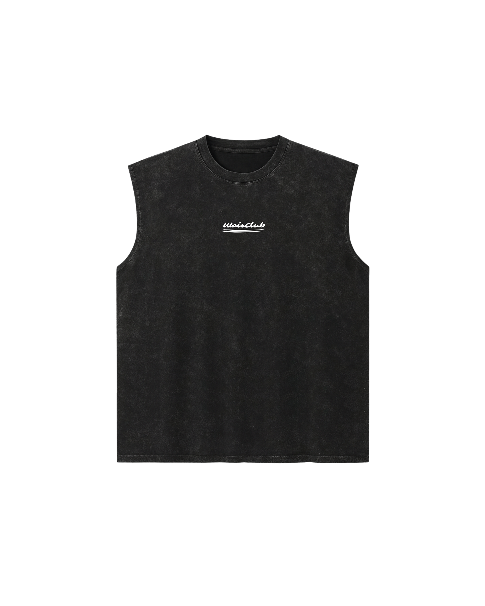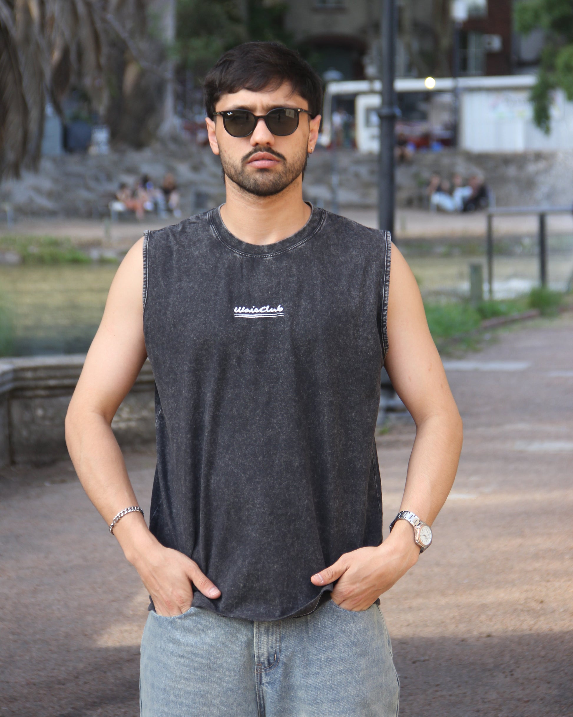 musculosa negra con acabado acid wash, corte regular fit y cuello redondo acanalado, 100% de algodón, presenta un diseño en bordado de color blanco por delante y por atrás contiene un diseño estampado de color blanco y rojo oscuro. El modelo mide 1.73 y está usando talle L.