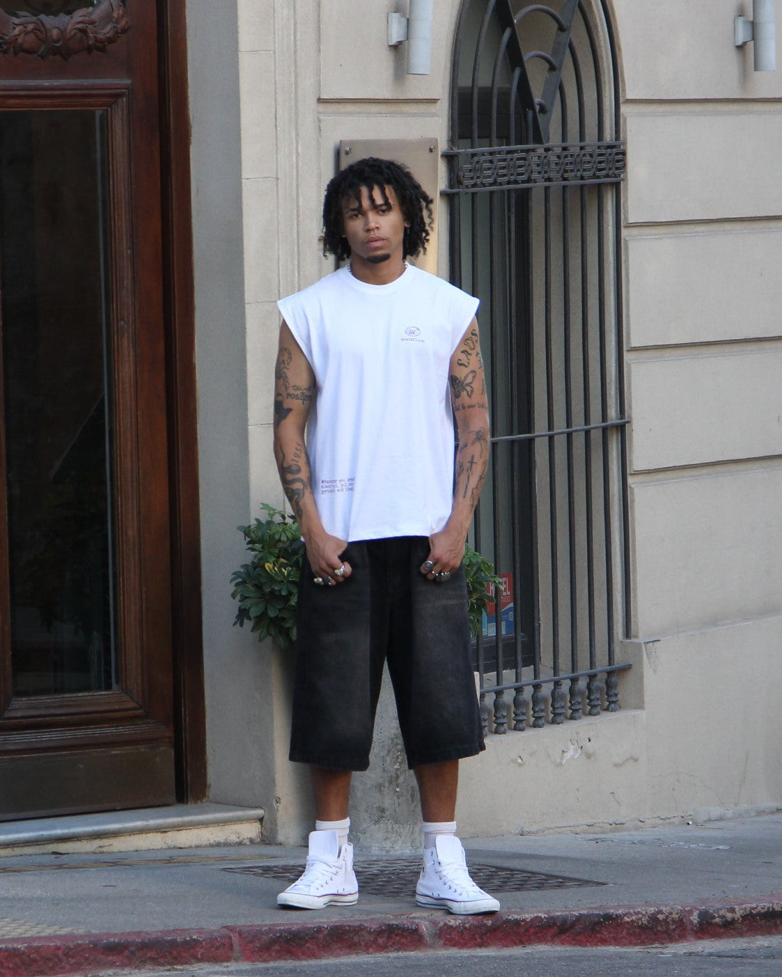 musculosa blanca de corte loose fit y cuello redondo acanalado, 100% de algodón, presenta dos diseños pequeños estampados color magenta apagado por delante y se completa con el diseño principal por atrás.
