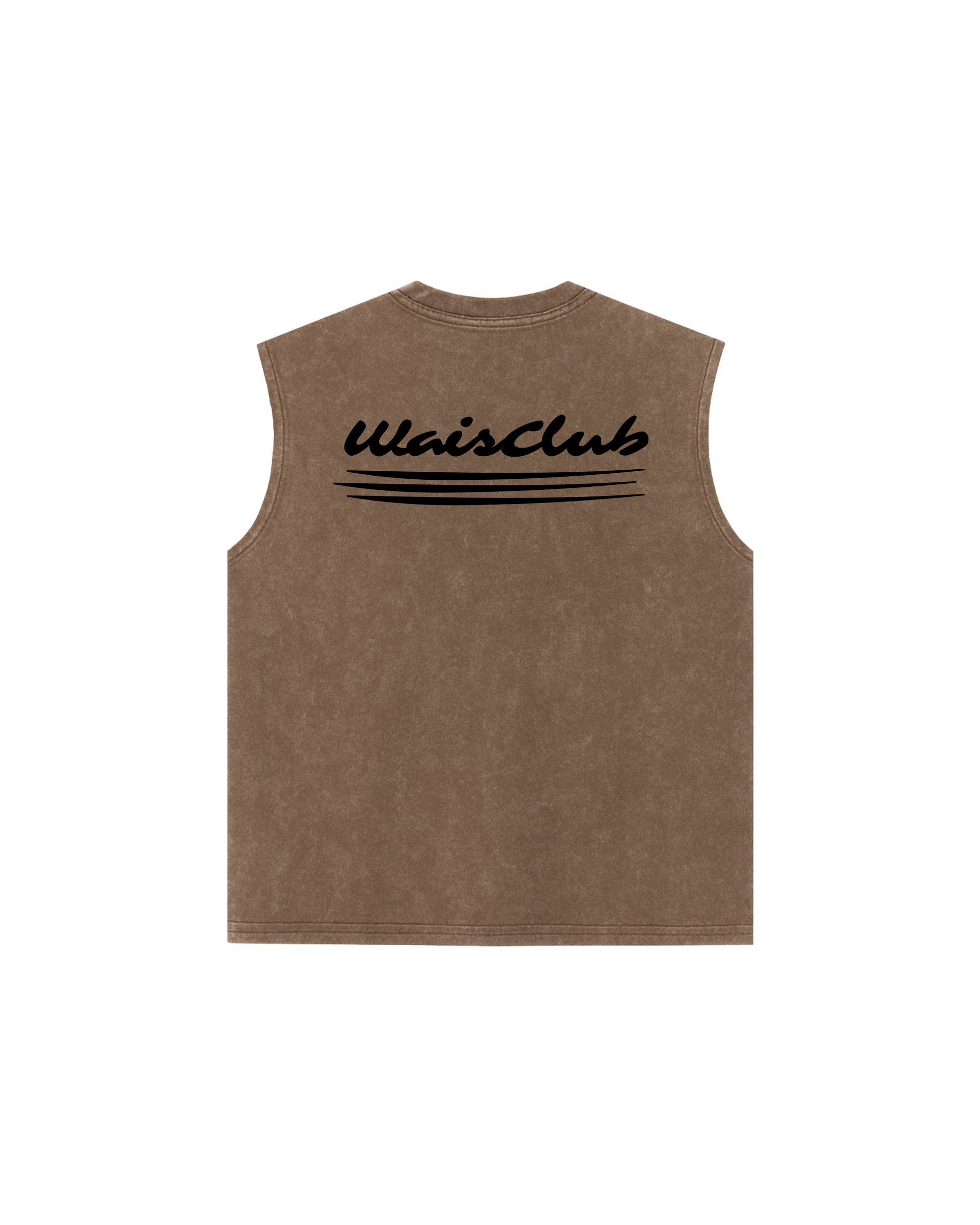 musculosa marrón con acabado acid wash, corte regular fit y cuello redondo acanalado, 100% de algodón, presenta un diseño en bordado de color marrón oscuro por delante y por atrás contiene un diseño estampado de color negro. El modelo mide 1.73 y estás usando talle L.