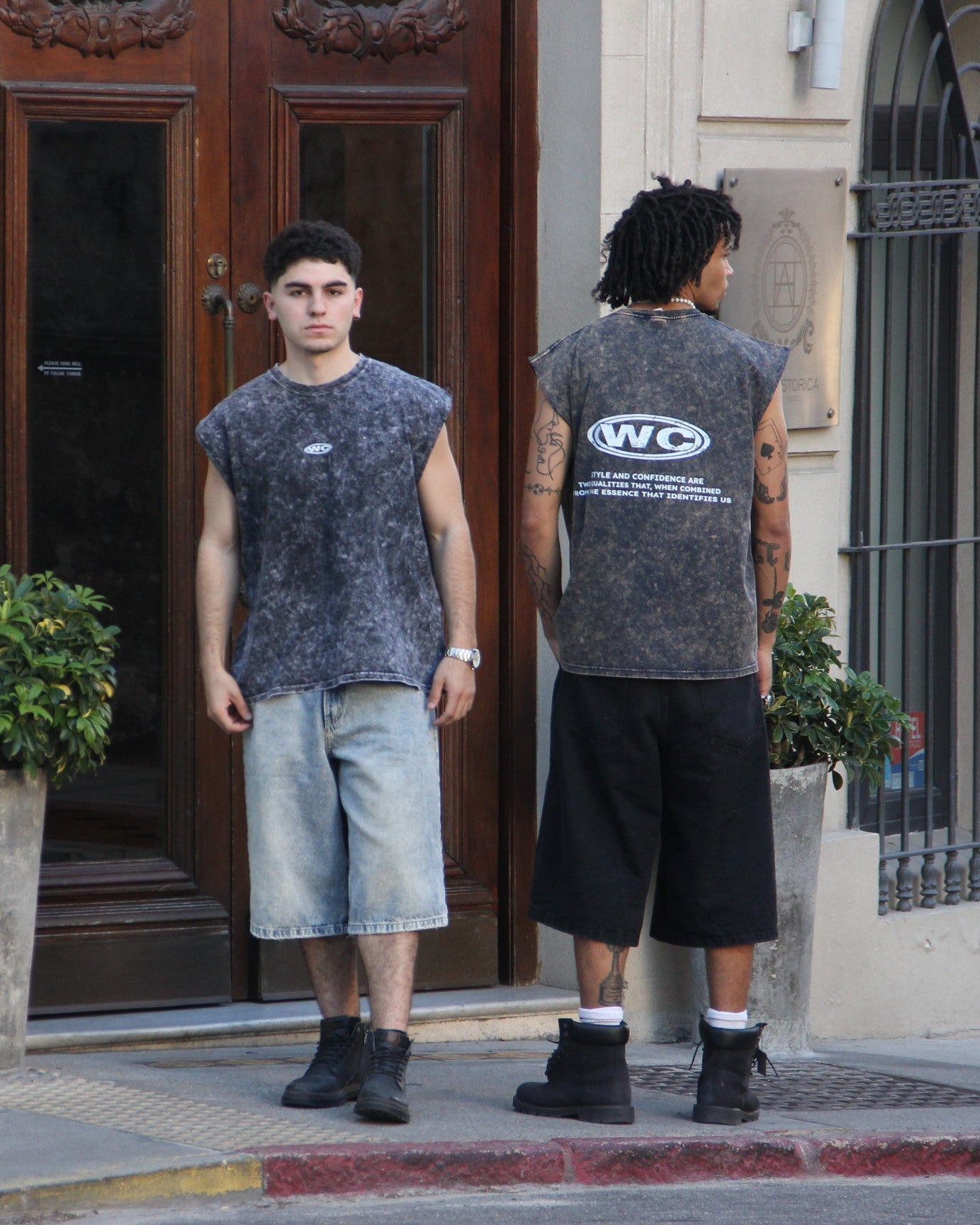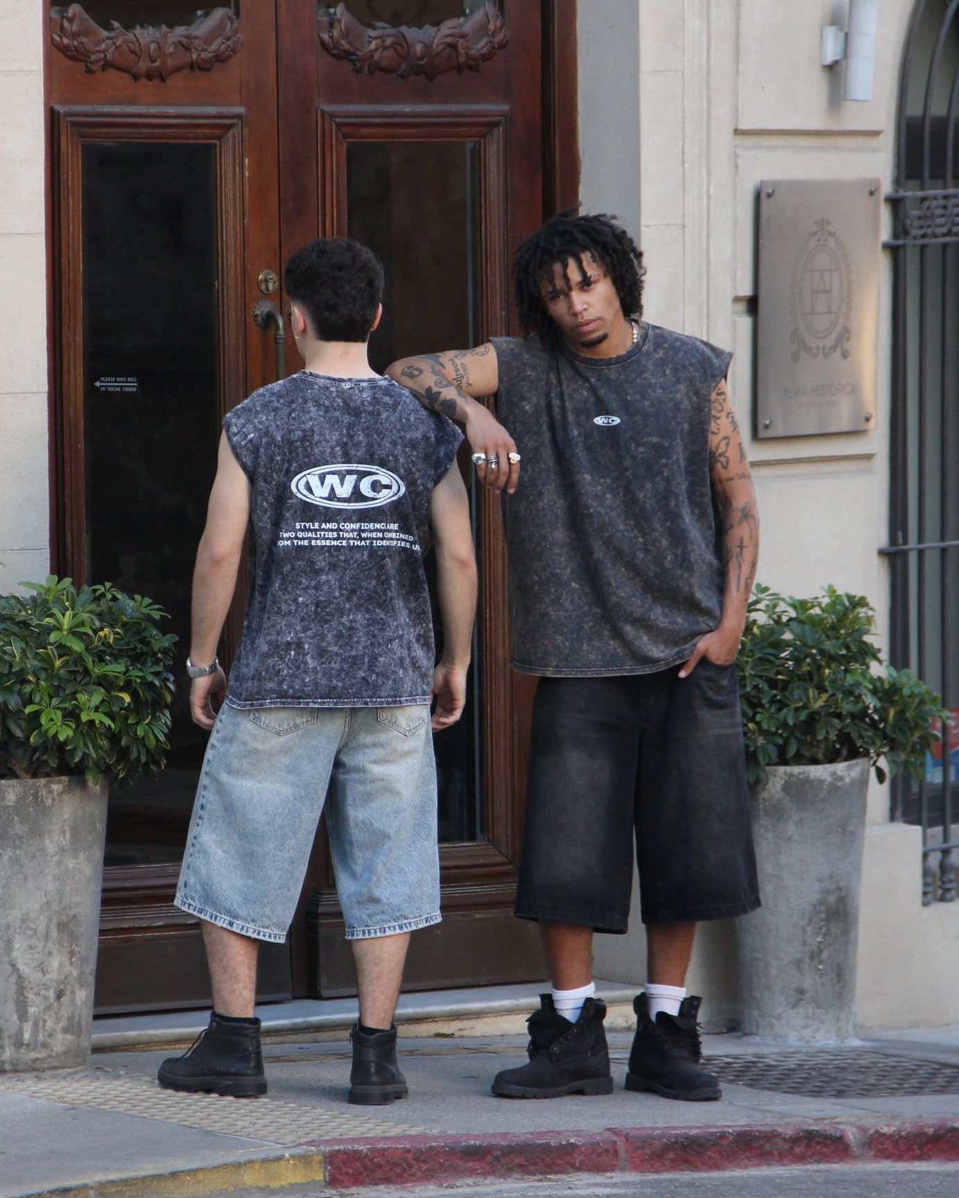 musculosa azul lavada de corte oversize y cuello redondo acanalado, 100% de algodón, presenta un diseño pequeño estampado en el centro del pecho color blanco por delante y se completa con el diseño principal por atrás.