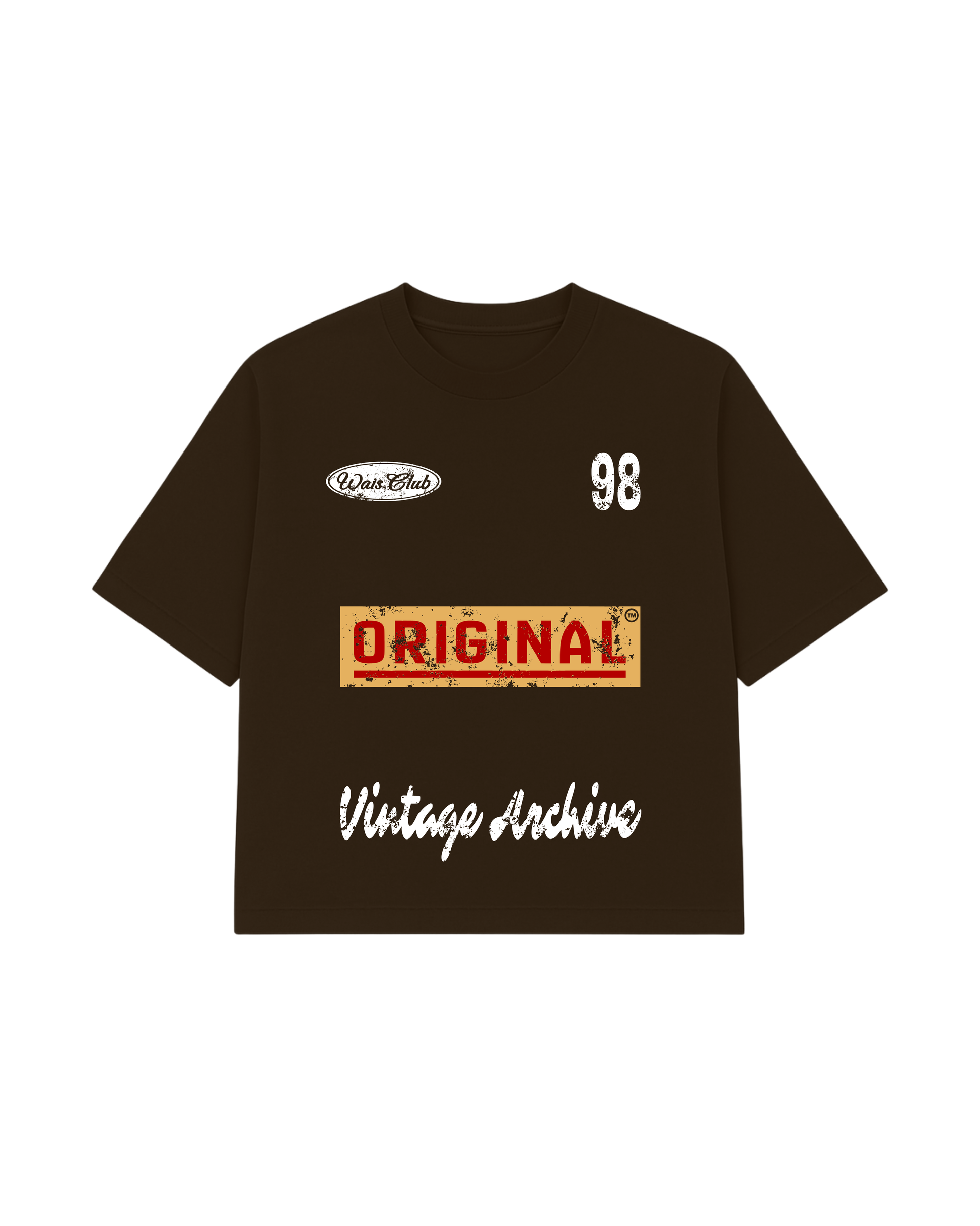 Remera color marrón confeccionada en 100 % algodón. Presenta un corte loose fit, cuello redondo acanalado y mangas hasta los codos. Contiene un diseño vintage con múltiples estampados en la parte delantera y se mantiene lisa por la parte de atrás.